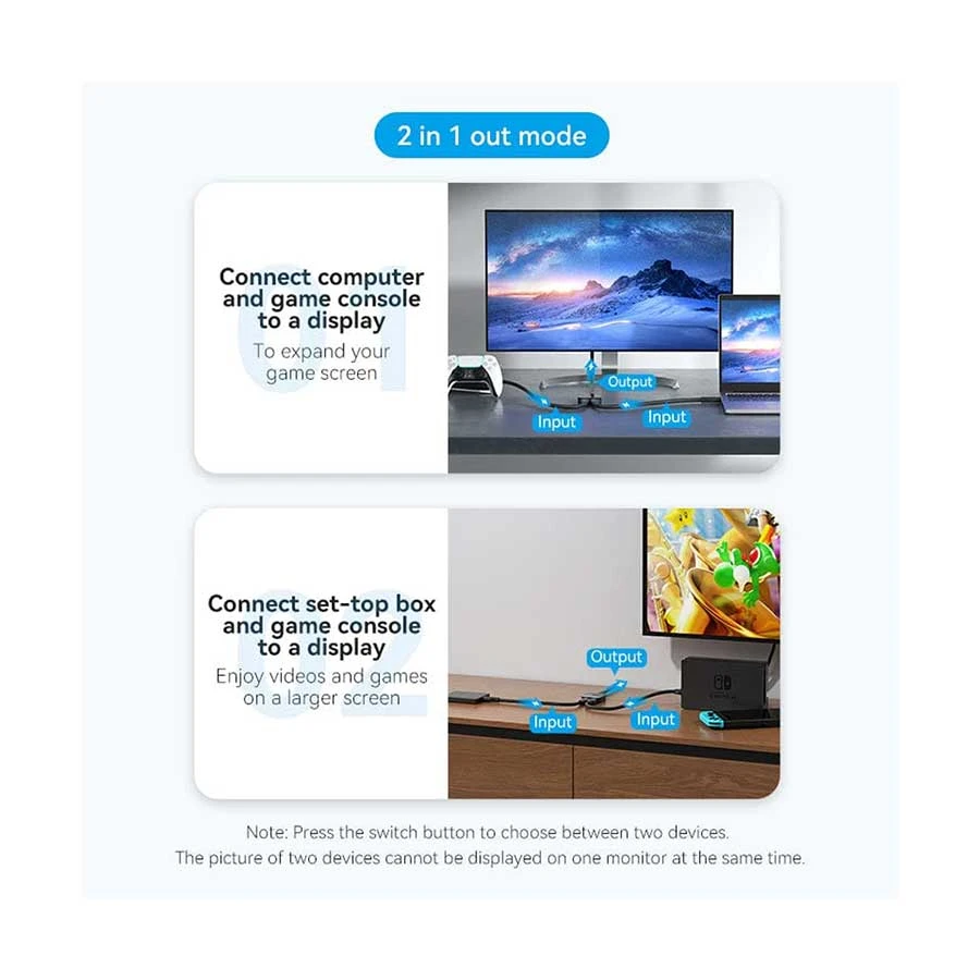 Upgrade your home entertainment setup with the Vention AKOB0 2-Port HDMI Bi-Direction 4K Switcher, a versatile solution that simplifies your multimedia experience. This switcher operates in a 2-in-1-out mode, allowing you to seamlessly connect a computer and game console or a set-top box and game console to a single display.